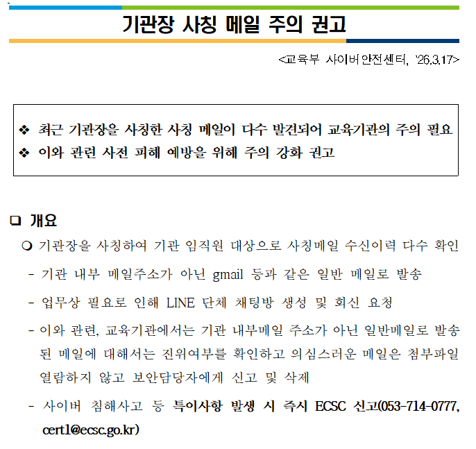 o 기관장을 사칭하여 기관 임직원을 대상으로 사칭메일 수신이 다수 발견
